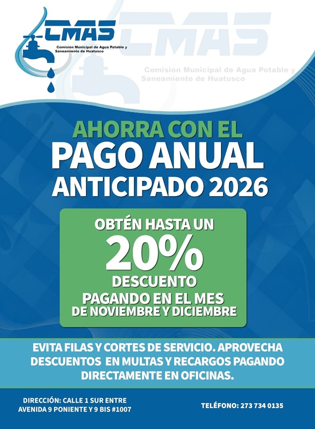 La CMAS Huatusco te invita a aprovechar hasta un 20% de descuento pagando durante noviembre y diciembre.
