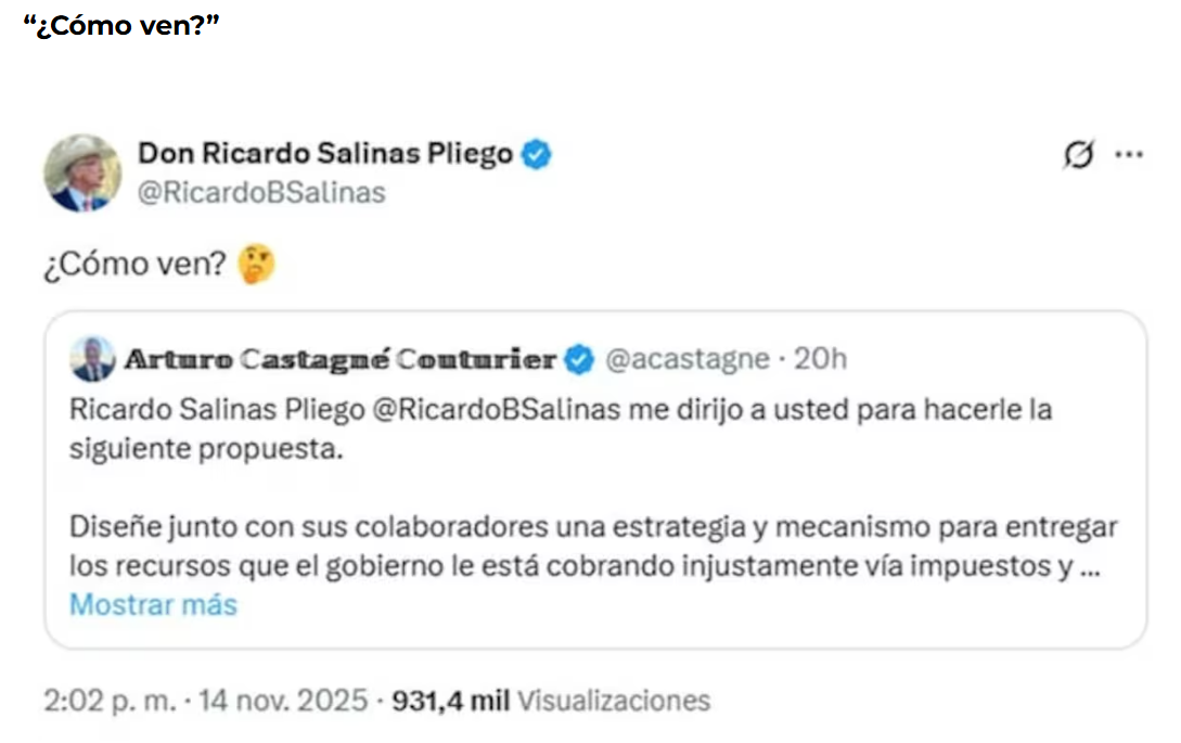 Un usuario en X propuso a Ricardo Salinas Pliego donar el monto que debe al SAT para apoyar a sectores vulnerables. El empresario respondió pidiendo la opinión del público y desató un intenso debate nacional.