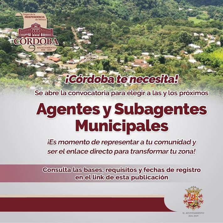 Córdoba, Ver. – El Ayuntamiento de Córdoba ha publicado la convocatoria oficial para la elección de Agentes y Subagentes municipales para el período 2026-30; se trata de un ejercicio que fortalece la democracia en las comunidades, por lo que las y los ciudadanos interesados tendrán del 02 al 06 de marzo para registrar sus respectivas candidaturas.