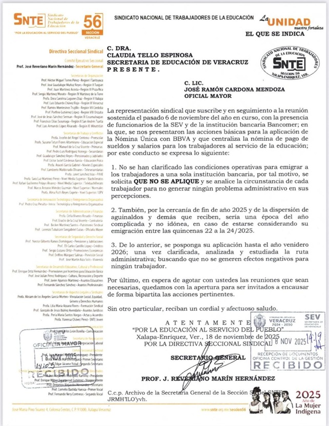 En un oficio sin número, de fecha 18 de noviembre y signado por el secretario general de esta organización magisterial, José Reveriano Marín Hernández, fundamenta su petición porque “no se han clarificado las condiciones operativas para emigrar a los trabajadores a una sola institución bancaria”.