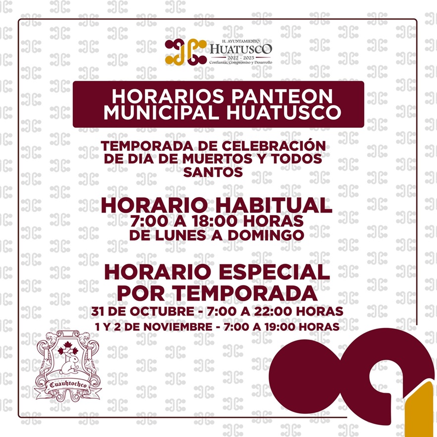 El H. Ayuntamiento de Huatusco informa a la ciudadanía que, con motivo de la temporada de celebración de Día de Muertos y Todos Santos, el Panteón Municipal contará con horarios especiales para brindar un mejor servicio a las familias que deseen visitar a sus seres queridos.