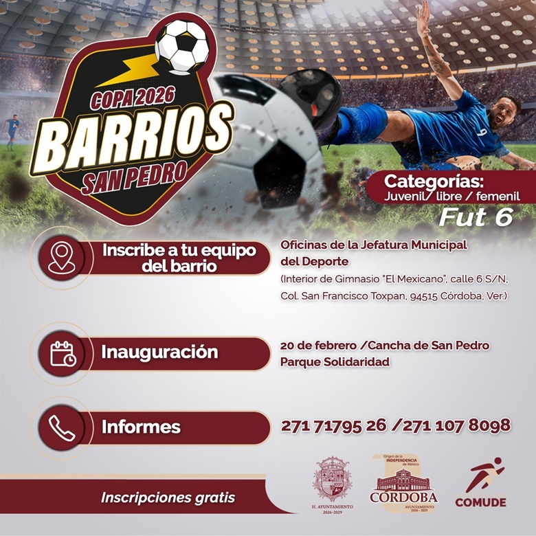Córdoba, Ver.- La fiebre mundialista poco a poco comienza a sentirse en todo el territorio nacional, y Córdoba también se prepara para la fiesta deportiva más importante del 2026. Por ello la Jefatura de Deporte del Ayuntamiento de Córdoba tiene preparados diversos eventos futbolísticos, el primero de ellos se trata de la Copa Barrios San Pedro 2026.