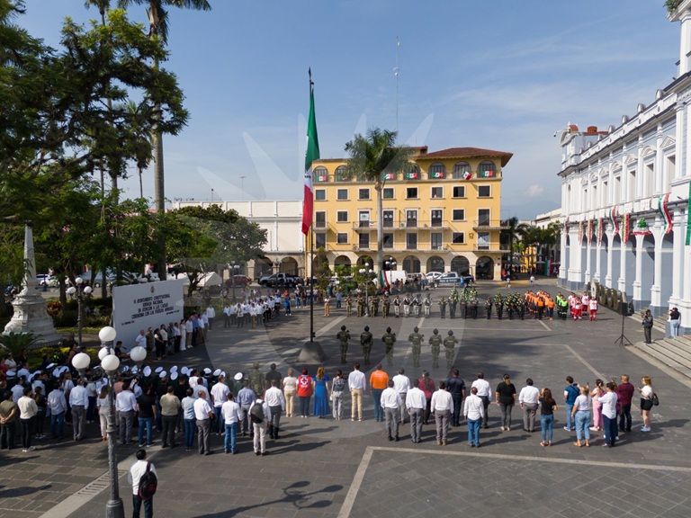 Encabezados por el alcalde, Dr. Juan Martínez Flores, integrantes de la comuna edilicia; la secretaria técnica regional de la Coordinación para la Construcción de la Paz y la Seguridad Región Córdoba, Minerva López Villegas y el teniente William Domínguez Pérez, comandante de la Guardia Nacional en Córdoba, estudiantes de la escuela Francisco Hernández y Hernández “Cantonal” y la Telesecundaria José María Pino Suárez, se rindieron los honores a la Bandera que fue escoltada por elementos de la Marina, quienes hicieron la entrega para su izamiento a toda asta al regidor noveno, Rodrigo Javier Flores Morales.